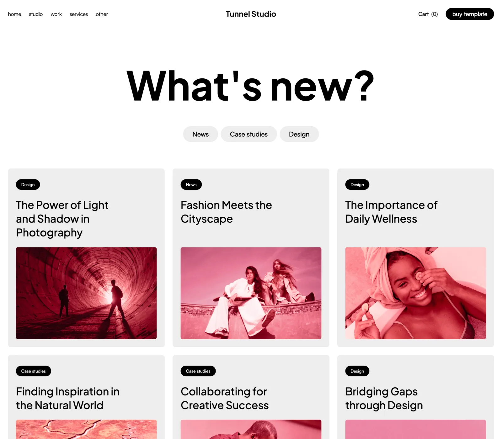 Tunnel Studio includes a projects, project filter, blog and blog tags collections that are made on the powerful Webflow CMS. This will let you add new content extremely easily.